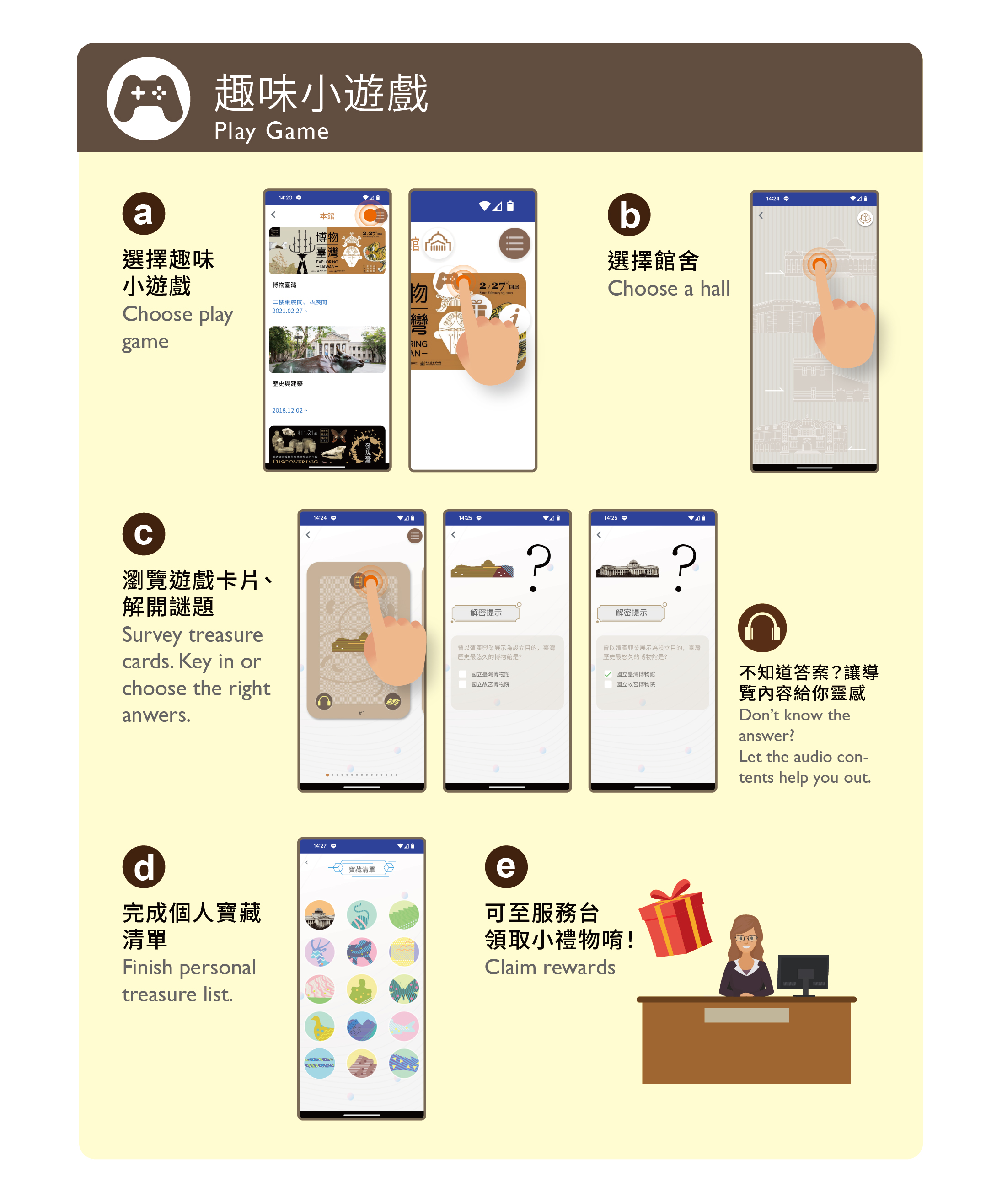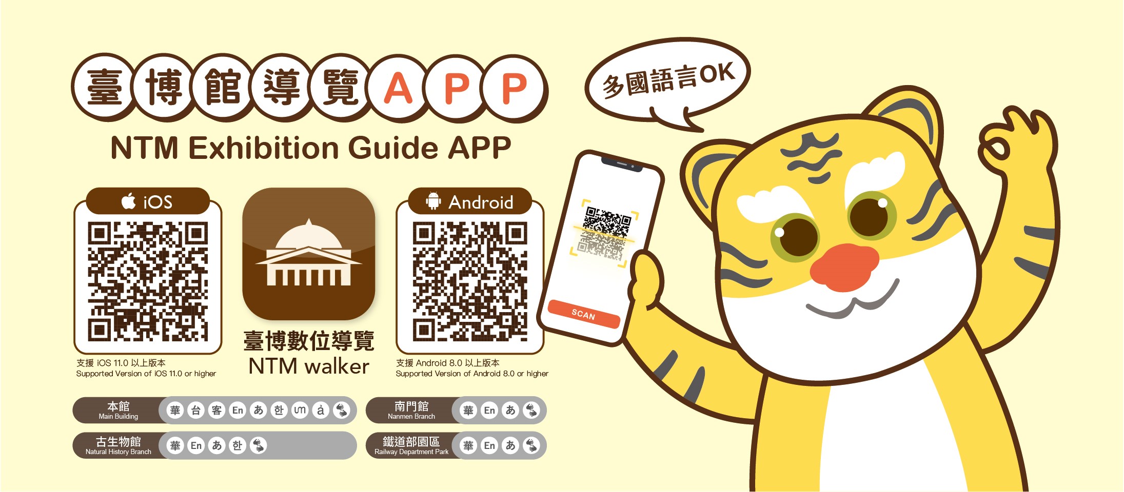 提供各館區常設展華語、英語、日語音導覽內容;本館常設展另提供臺灣台語、臺灣客語、韓語、東南亞語(印尼、越南語)及臺灣手語版。還有推出各館卡牌遊戲,只要闖關成功就可兌換精美小禮唷!