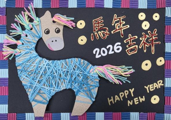 藉由彩色毛線裝飾馬身、鬃毛及馬尾,並以金粉蔥粉飾過年的吉祥話,金屬筆點畫圖案及貼黏畫框,製作出一幅喜氣洋洋「吉馬迎春」的貼畫。 |