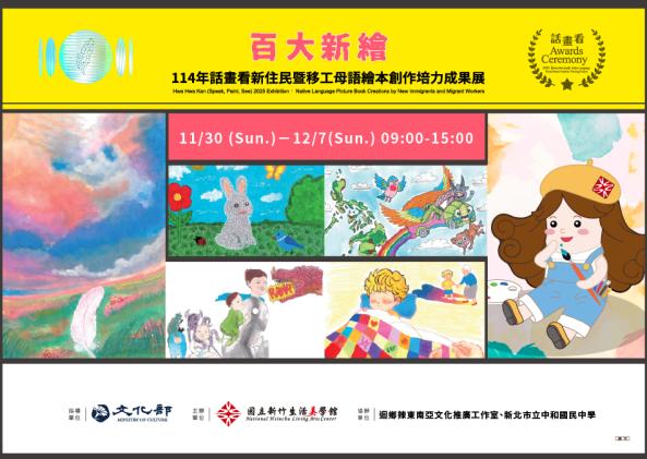 本次展覽於文化部百大文化基地「迴鄉辣東南亞文化基地」展示114年話畫看繪本培力工作坊學員32本成果作品,結合多元母語繪本與百大文化基地團隊共同展現「新」力量,共同推廣多元文化。