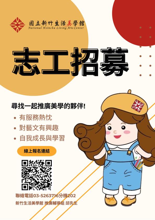 我們誠摯邀請具藝⽂素養或興趣,且有責任感的您,透過本館提供的教育訓練與增能培⼒,成為閃亮、⾃我實踐、溫暖的志願服務者,讓藝⽂之美觸及更多⼼靈!