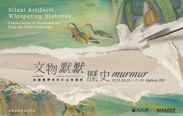 文物不語,卻能娓娓訴說歷史;藝術美感之外,文物還承載了什麼? 「文物默默.歷史MURMUR—典藏臺灣美術作品修護展」,是史博館近年執行文化部「重建臺灣藝術史」計畫之精選成果。透過對典藏臺灣美術文物的研究、維護、展示與近用推廣,讓更多觀眾與多重世代認識與欣賞,這些屬於全民的珍貴資產與文化載體,發揮美學教育、傳承歷史、重建藝術史脈絡、以及共享文化記憶。