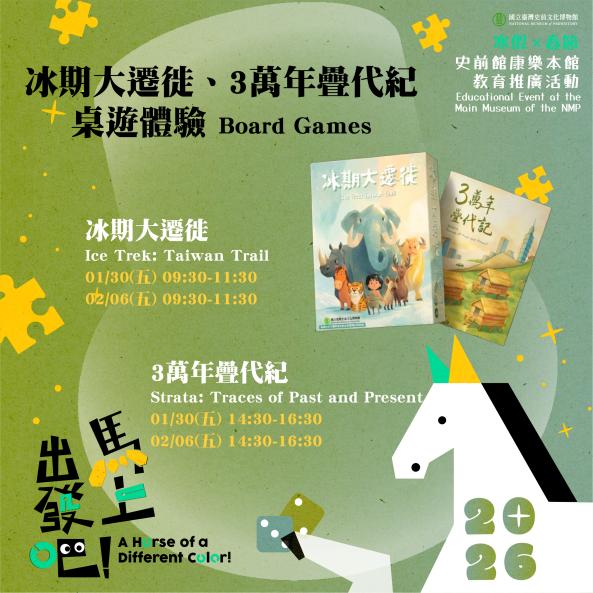 繼推出「南島航行」桌遊後,史前館全新呈現「3萬年疊代記」、「冰期大遷徙」兩款桌遊,結合展廳導覽,讓大家得以不同方式探索臺灣史前史、暢玩臺灣自然史,邀請大家一玩遊戲、認識臺灣的故事!