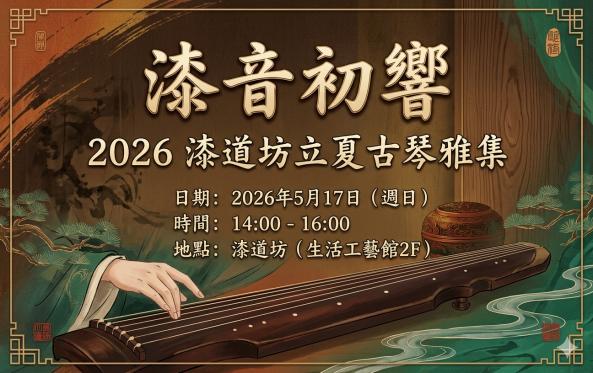 漆道坊首次大漆與古琴交會的雅集,由漆道坊 梁晊瑋、洪志耀、周仕蓉 三位老師領銜,帶領工坊習琴、斵琴的同門,在立夏時節,將這份沈穩的漆藝之美,轉化為迴盪在指尖的絃歌。