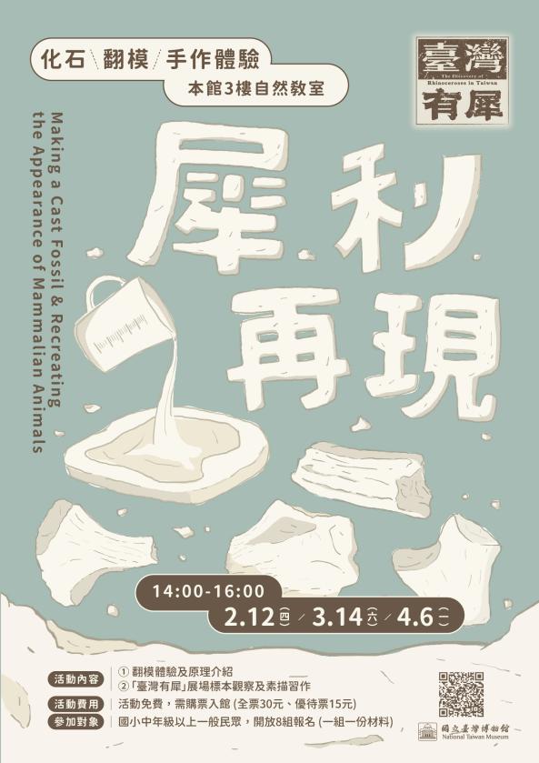 「臺灣有犀」特展細數犀牛化石在臺灣被發現、調查及研究相關歷程,包含臺博館1974年「二百萬年前犀牛化石復原展覽」、「博物臺灣」常設展展出1999年研究團隊依照真實犀牛骨骼考據的重新復原。你是否也很好奇出土原件是如何變身為展場中展示的復原件?博物館館員將帶領民眾實際動手進行真實哺乳動物化石翻模體驗, 一起想像面對化石和古生物的驚奇與新奇。