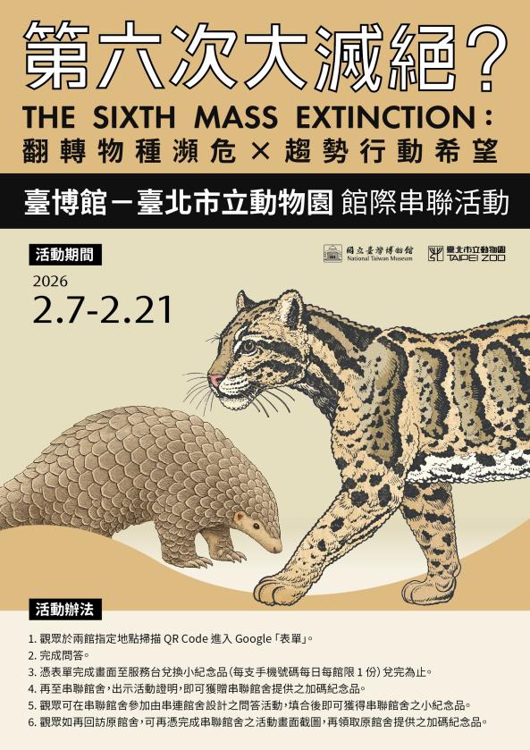 當地球正面臨前所未有的生物危機,我們能選擇旁觀,還是一起行動? 配合南門館特展 「第六次大滅絕?命運還是機會」,本館攜手 臺北市立動物園 推出跨館串聯的環境教育行動,邀請民眾用最輕鬆、也最有力量的方式,加入守護生物多樣性的行列。 活動以 「翻轉物種瀕危 × 趨勢行動希望」 為主題,串聯多個國際保育重要日,從 2 月 7 日「世界瀕危行動日」 到 2 月 21 日「世界穿山甲日」,讓保育不只是展板上的文字,而是可以親身參與的行動體驗。