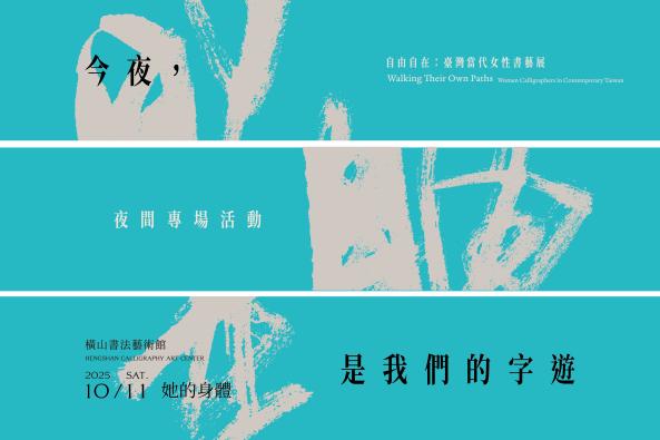 橫山書法藝術館《自由自在:臺灣當代女性書藝展》以「女性書藝」為核心,從筆墨之間探索身分、性別與創作的自由。展覽特別規劃夜間專場活動「今夜,是我們的字遊」,讓觀眾在不同形式的表演、對談與導覽之間穿梭,感受女性書藝與當代議題的共鳴。