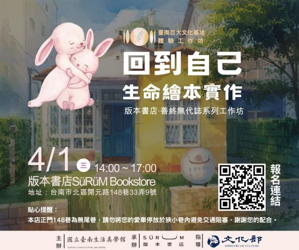 115年「版本書店SüRüM Bookstore」獲選為文化部首屆「百大文化基地」,本工作坊以『「善終無代誌」系列工作坊:《回到自己》生命繪本實作』為主題,透過基地導覽、文化體驗及實作,邀請您一同來感受具臺灣歷史脈絡及多元文化內涵的基地之旅。