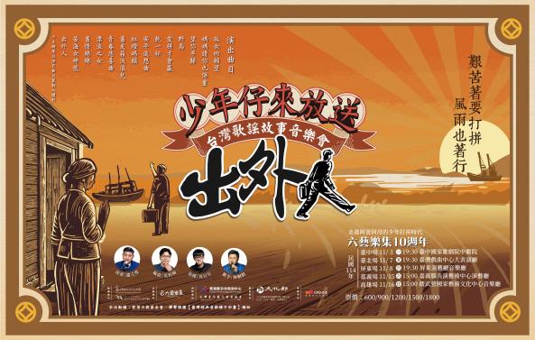 六藝樂集《出外人》—少年仔來放送,結合戰後台語歌謠、說書與電台,重返1970年代。以「電台實境說書」貫穿全場,觀眾彷彿坐進電台,聽DJ播放歌曲、說故事、邀來賓對談,搭配歌手與樂團現場演出,讓觀眾回到阿公阿嬤收音機旁的時光。演出曲目從〈出外人〉、〈孤女的願望〉,描繪當年為生活離鄉打拼「出外人」的身影。