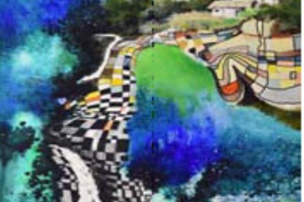 這次畫展中的油彩創作技法留有印象派的影子,卻在布局構圖中以抽象的觀點詮釋,運用西式水彩的透明感與近代中國彩墨的皴法及潑墨法,讓油彩創作以非傳統堆疊式風格來表現。(例如圖三-瀑布)
